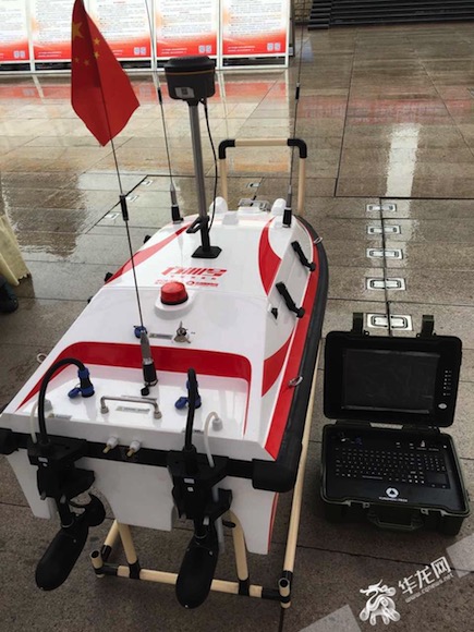 現(xiàn)場展出的無人測繪船。首席記者 佘振芳 攝
