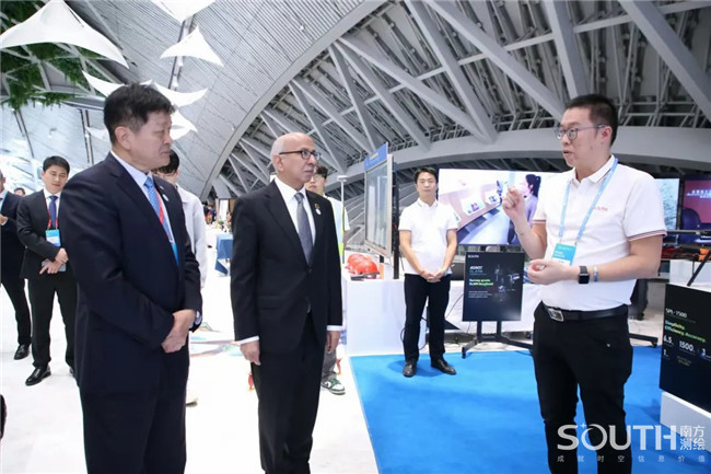 聯(lián)合國助理秘書長納維德·哈利夫(右二)聯(lián)合國全球地理信息知識與創(chuàng)新中心主任李朋德(右三)蒞臨南方測繪展位