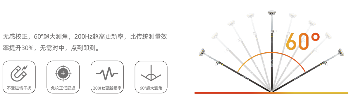 慣導(dǎo)傾斜測量 | 內(nèi)置IMU慣性測量傳感器,支持慣導(dǎo)傾斜測量功能,根據(jù)對中桿傾斜方向和角度自動校正坐標(biāo) |