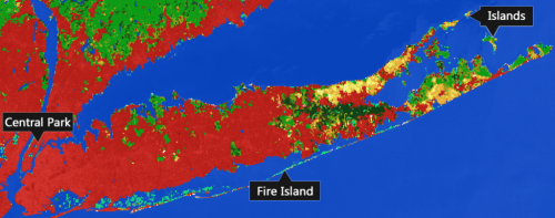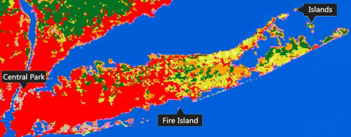 從圖片可以看出,在這種土地類(lèi)型分類(lèi)方法下,中央公園被表達(dá)出來(lái)了,但是火島和長(zhǎng)島島嶼并未出現(xiàn)在地圖中。