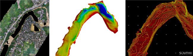 技術(shù)團(tuán)隊(duì)采用了南方SU20無(wú)人船搭載測(cè)深儀測(cè)量水下地形、南方無(wú)人機(jī)掛載傾斜攝影相機(jī)測(cè)量?jī)砂兜匦?,?dāng)晚就完成了水下外業(yè)勘測(cè),并于7日上午完成了全部外業(yè)勘測(cè)。內(nèi)業(yè)小組爭(zhēng)分奪秒處理測(cè)量數(shù)據(jù),生產(chǎn)三維實(shí)景模型并繪制兩岸標(biāo)準(zhǔn)地形圖,7日中午輸出了初步成果。