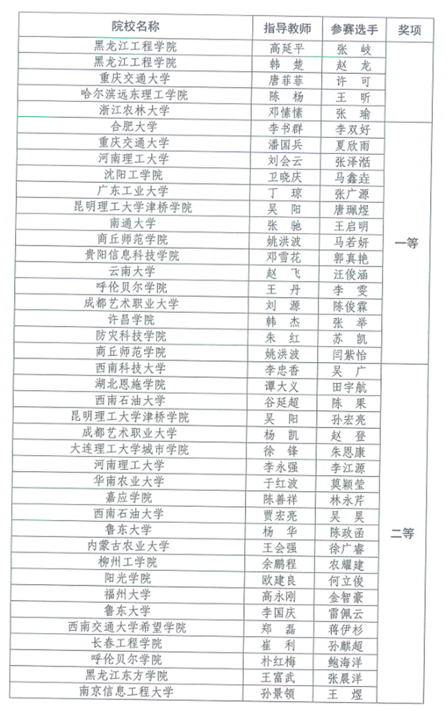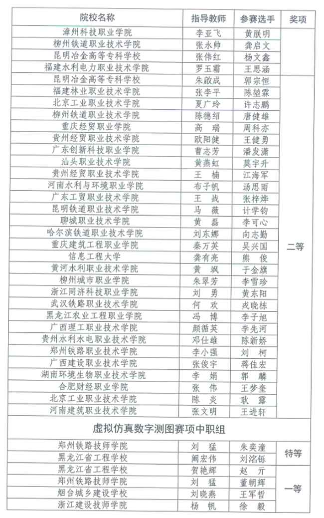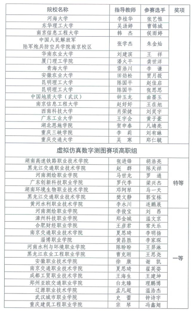 由自然資源部人力資源開發(fā)中心主辦,全國測繪地理信息職業(yè)教育教學(xué)指導(dǎo)委員會(huì)、全國測繪地理信息行業(yè)產(chǎn)教融合共同體協(xié)辦,河南測繪職業(yè)學(xué)院承辦,南方測繪集團(tuán)獨(dú)家冠名并提供技術(shù)支持的“南方測繪杯”第四屆全國大學(xué)生測繪地理信息虛擬仿真技能競賽(以下簡稱“競賽”)以選手線上比賽、裁判線上監(jiān)考和線下集中打分的形式順利完賽,經(jīng)過大賽組委會(huì)審定,現(xiàn)將獲獎(jiǎng)結(jié)果予以公布。