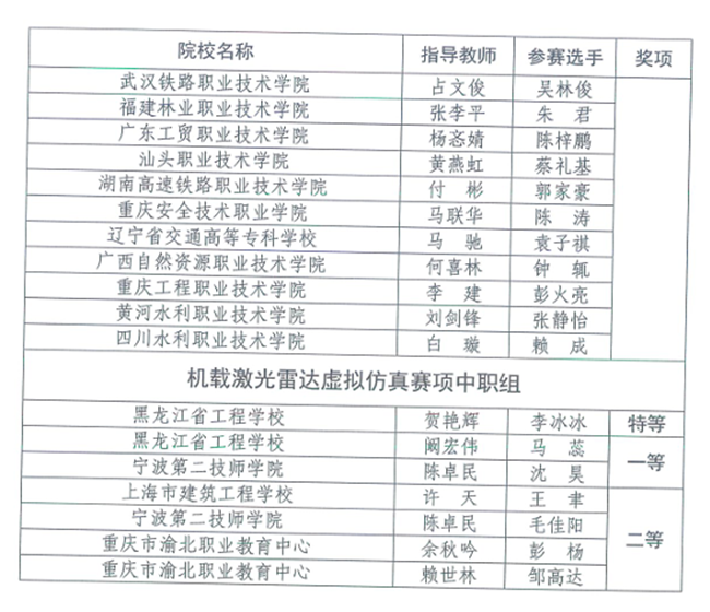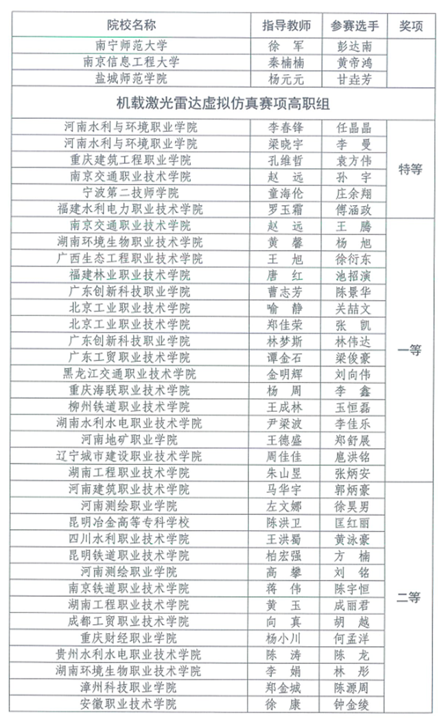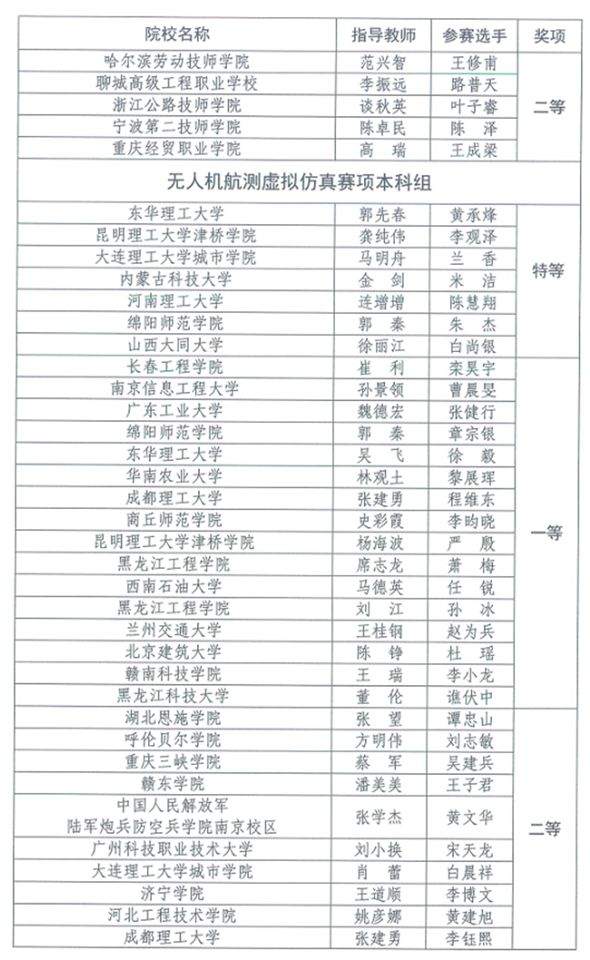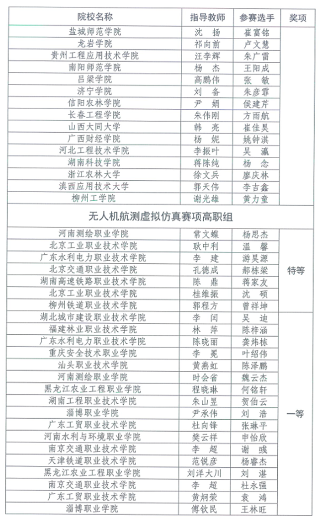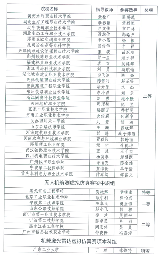 競賽設(shè)本科、高職???、中職3個(gè)類別,每個(gè)類別設(shè)虛擬仿真數(shù)字測圖、無人機(jī)航測虛擬仿真、機(jī)載激光雷達(dá)虛擬仿真3個(gè)賽項(xiàng),獎(jiǎng)項(xiàng)分為優(yōu)秀團(tuán)體獎(jiǎng)、賽項(xiàng)獎(jiǎng)和優(yōu)秀指導(dǎo)教師獎(jiǎng)。(完整獲獎(jiǎng)名單附后)