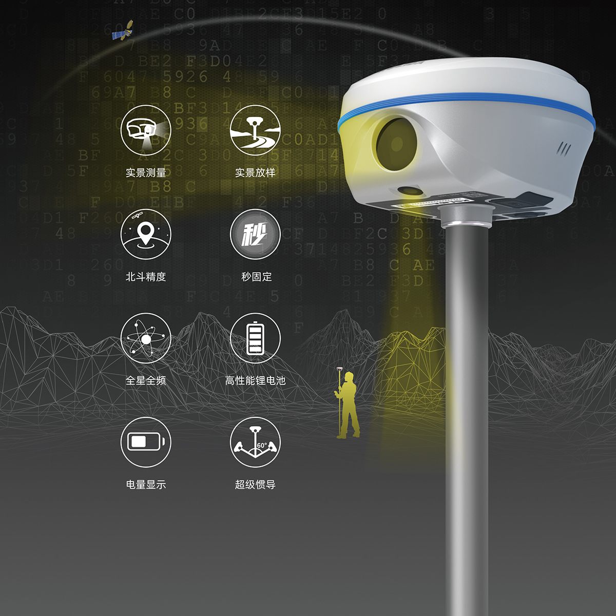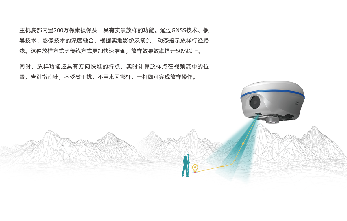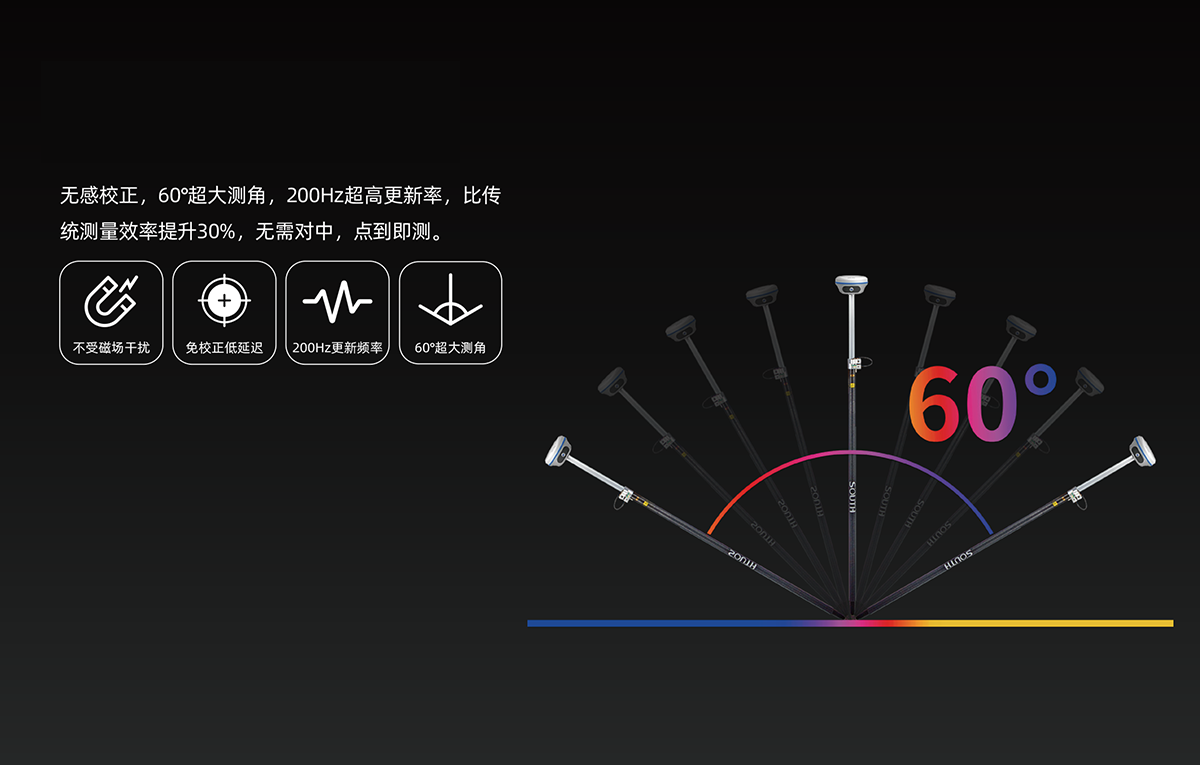慣導傾斜測量 | 內(nèi)置IMU慣性測量傳感器,支持慣導傾斜測量功能,根據(jù)對中桿傾斜方向和角度自動校正坐標。 |