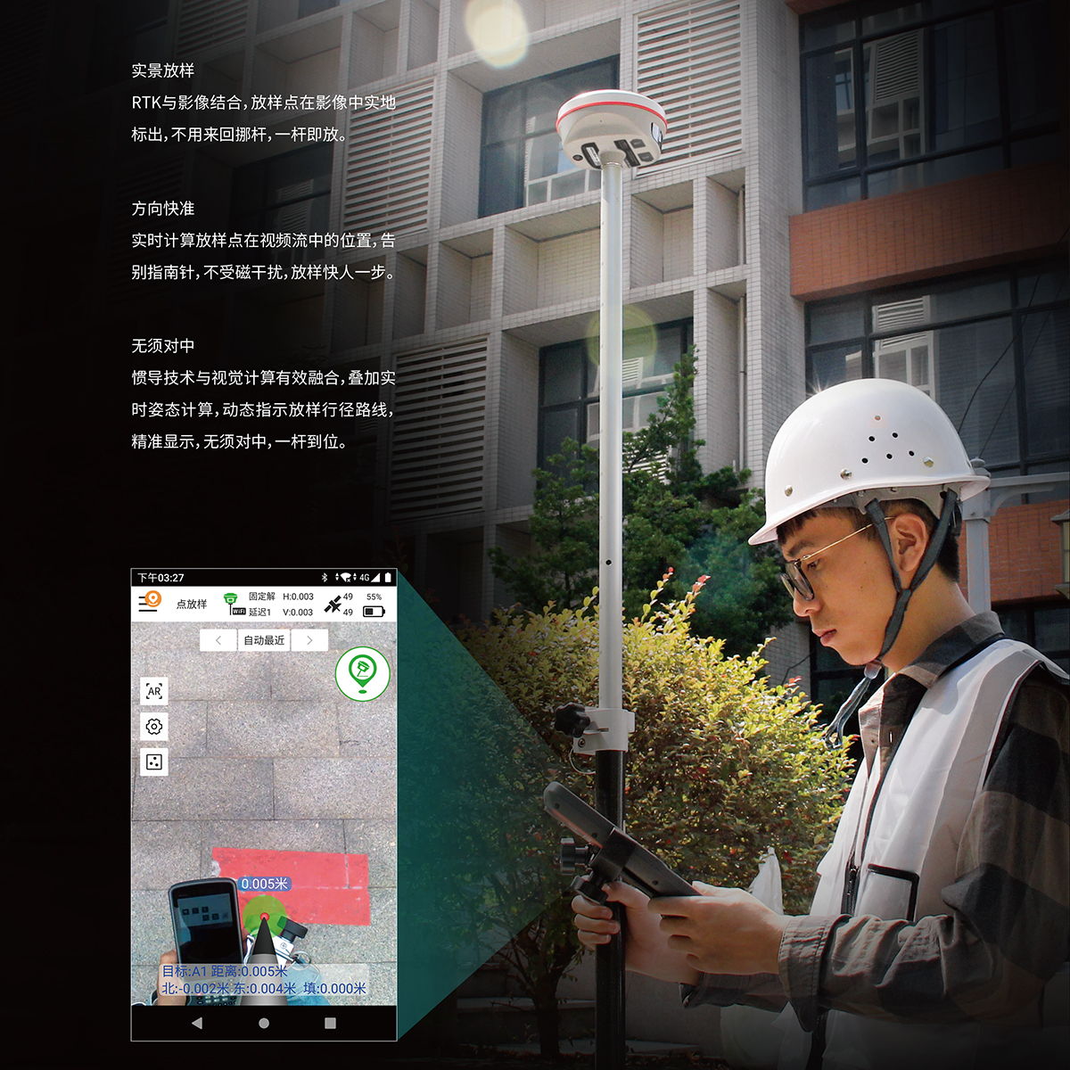 慣導(dǎo)傾斜測量 | 內(nèi)置IMU慣性測量傳感器,支持慣導(dǎo)傾斜測量功能,根據(jù)對中桿傾斜方向和角度自動校正坐標(biāo)。 |