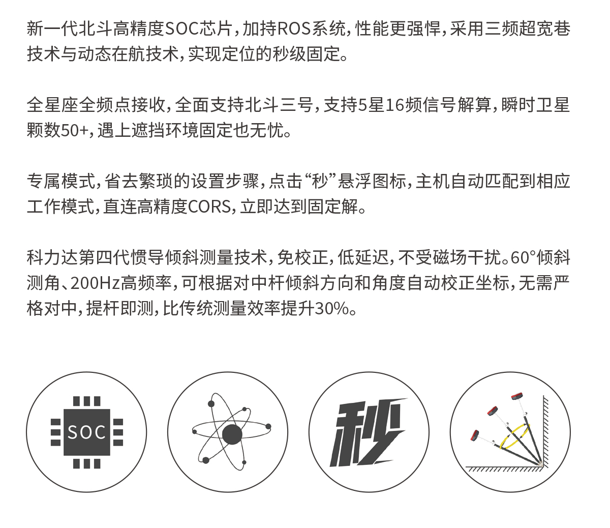 慣導(dǎo)傾斜測(cè)量 | 內(nèi)置IMU慣性測(cè)量傳感器,支持慣導(dǎo)傾斜測(cè)量功能,根據(jù)對(duì)中桿傾斜方向和角度自動(dòng)校正坐標(biāo)。 |