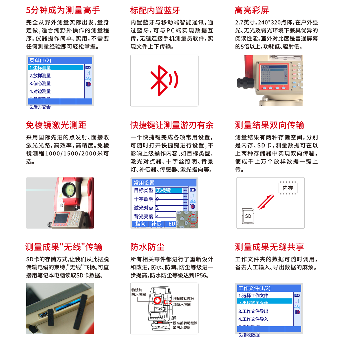 精度 | 0~500m:±(3+2×10-6·D)mm 500~1000m:±(5+2×10-6·D)mm 1000~2000m:±(10+2×10-6·D)mm |