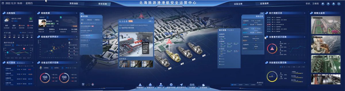 以數(shù)字孿生技術(shù)為核心,對旅游港口的商業(yè)街、航站樓、碼頭、游船、航線、水下地形進行高精度3D建模,通過對不同事件的模擬仿真和實時監(jiān)測,深度服務船舶航前檢查、航行安全監(jiān)測、船舶靠泊監(jiān)管、船舶機務安全、港口特種作業(yè)監(jiān)管、港口隱患排查、港口風險管控等業(yè)務場景,動態(tài)呈現(xiàn)當前航線、港口的安全態(tài)勢和風險等級,為港口運營部門提供安全輔助決策、隱患過程管控、風險及時預警、事故應急指揮、日常運營等核心功能。